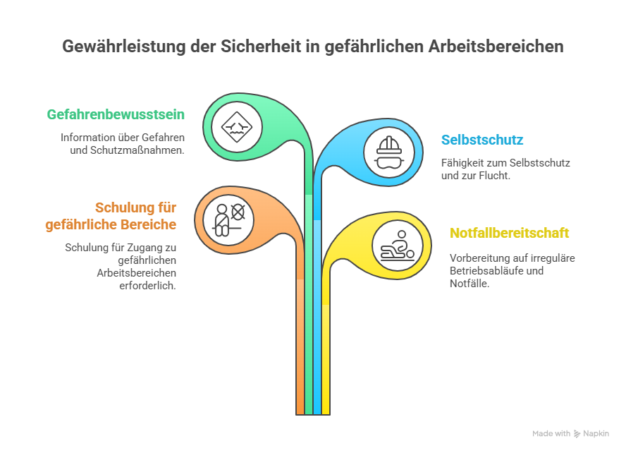 Nur Beschäftigte, die zuvor geeignete Anweisungen erhalten haben, dürfen Zugang zu besonders gefährlichen Arbeitsbereichen haben. Dazu gehört auch, Beschäftigte für irreguläre Betriebsabläufe oder Notfallsituationen eigens auszubilden. Beschäftigte, die sich in erheblicher unmittelbarer Gefahr befinden, müssen außerdem sowohl über die Gefahr als auch über mögliche Schutzmaßnahmen unterrichtet sein. Sie müssen sich selbstständig schützen und sich gegebenenfalls sofort in Sicherheit bringen können.