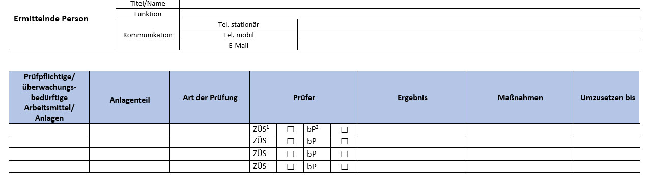 Die wiederkehrende Prüfung meint die regelmäßige Inspektion von Arbeitsmitteln und von Anlagen, die überwachungs- oder prüfpflichtig sind (z. B. elektrische Geräte, Druckbehälter, Maschinen). Eine sach- und fachgerechte Prüfung hilft, Gefährdungen frühzeitig zu erkennen und die Betriebssicherheit zu gewährleisten.
