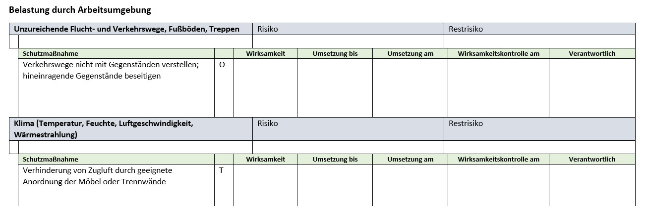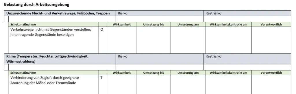 - Strukturierte Felder zur Beschreibung von Gefährdungen, Bewertung, Maßnahmen, Verantwortlichen und Fristen für die Umsetzung