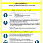 Persönliche Schutzausrüstung (PSA) wird zur Verfügung gestellt, wenn Unfallverhütungsvorschriften und staatliche Vorschriften, hygienische Gründe, gesundheitliche Gefahren oder Witterungseinflüsse es erfordern. Die Betriebsanweisung zur PSA informiert Beschäftigte über die korrekte Auswahl, Nutzung und Pflege der PSA. Das könnte beispielsweise so aussehen wie in dieser Word-Vorlage für eine Betriebsanweisung für PSA.