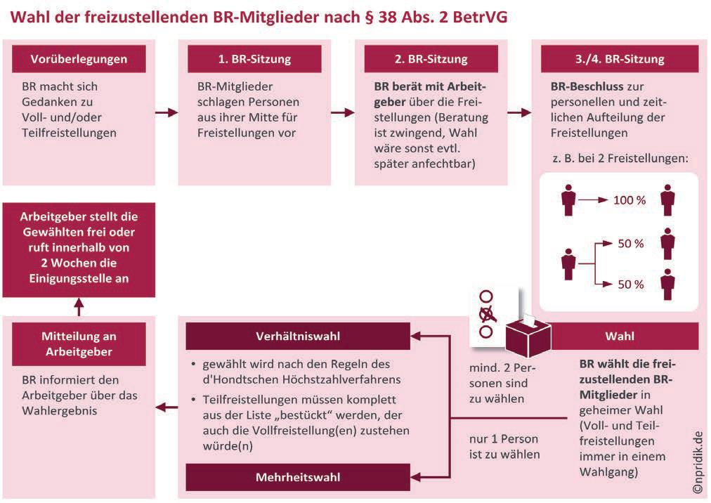 Betriebsratswahl. Das BetrVG kennt zwei Arten von Freistellungen: § 37 Abs. 2 BetrVG regelt die vorübergehende Arbeitsbefreiung der BR-Mitglieder, um Gremiumsaufgaben zu erfüllen; § 38 BetrVG hingegen sieht in Gremien ab neun Mitgliedern die komplette Freistellung eines oder mehrerer Mitglieder vor. Nur im Falle des § 38 Abs. 2 BetrVG muss der/die freigestellte/n Kollege/n gewählt werden. Zwar ist die Möglichkeit der Freistellung nicht verpflichtend, aber Sie sollten diese Chance wahrnehmen. Der Arbeitsaufwand erreicht in größeren Gremien solche Dimensionen, dass er nur mit Freistellungen sinnvoll zu bewältigen ist.