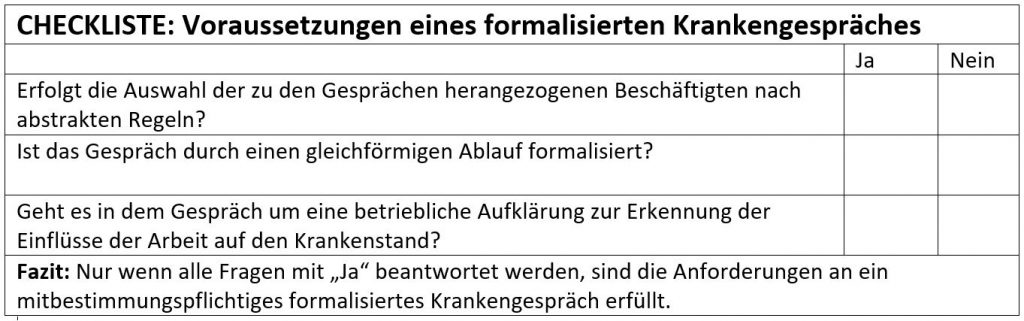 Will ein Arbeitgeber mit einzelnen Beschäftigten „Fürsorgegespräche“ wegen ihres Krankenstandes führen, muss er den Betriebsrat nicht um Zustimmung bitten, wenn es sich um nicht formalisierte Gespräche handelt, die das Ziel verfolgen, die Krankheitsursachen und die damit zusammenhängenden Arbeitsbedingungen zu klären.