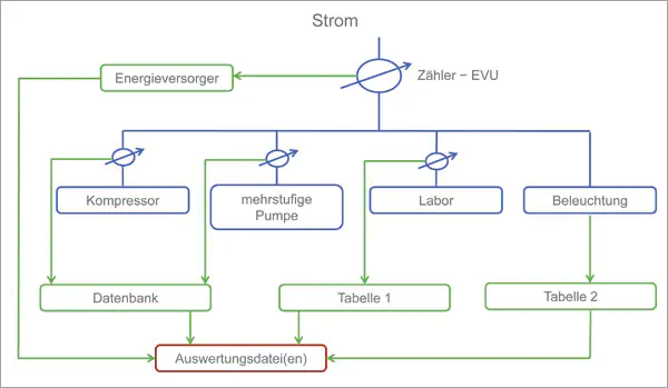 - Die grünen Linien sind die Datenflüsse von den Zählern.