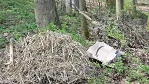 Ungefähr 100 m weiter besteht eine Zufahrt zu einem Waldweg. Hier haben Personen, die ihren Abfall wild ablagern wollen, ungehindert Zugang. An mehreren Stellen wurde hier auch tatsächlich Müll wild abgelegt, wie die dort erstellten Bilder belegen.