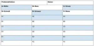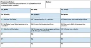 Zunächst einmal erläutert der Geschäftsführer, Herr Müller, die Unternehmenssituation und den daraus resultierenden Handlungsbedarf. Er vergewissert sich, dass alle Mitarbeiter das Problem verstanden haben, und formuliert die Frage, die in dem Formular, welches nun ausgeteilt wird, bereits eingetragen ist.