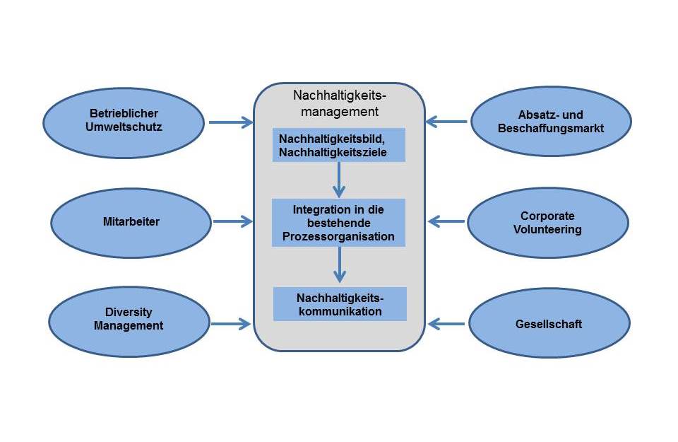 Was hat Ihr Unternehmen davon, wenn es gesellschaftliche Verantwortung übernimmt? Dies wird nicht nur Vertrauen bei Ihren Kunden, in der Öffentlichkeit und gegenüber anderen Anspruchsgruppen schaffen, sondern auch Ihre Chancen verbessern, die besten Mitarbeiter zu gewinnen. Darüber hinaus wirkt ein Nachhaltigkeitsmanagement positiv auf Ihre Investoren, die Sie so zur Bereitstellung weiterer Finanzmittel bewegen können. Letztendlich verbessert ein gesellschaftlich verantwortliches Handeln das Image Ihres Unternehmens und stärkt damit dessen Wettbewerbsfähigkeit. Die Abbildung zeigt die Systematik des Nachhaltigkeitsmanagements.
