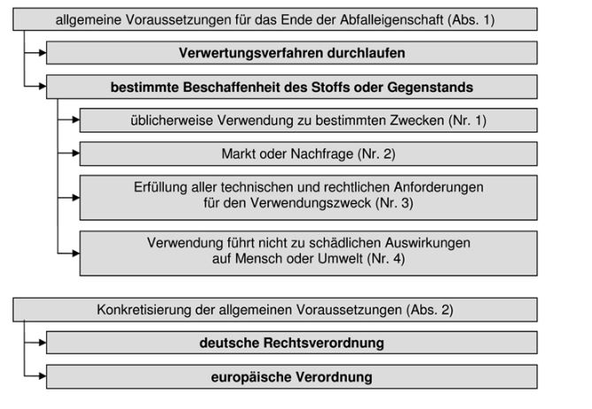 Nach Absatz 1 entfällt die Abfalleigenschaft mit dem Durchlaufen eines Verwertungsverfahrens, sofern der daraus resultierende Stoff oder Gegenstand für bestimmte Zwecke verwendet wird, Gegenstand eines Marktes oder einer Nachfrage ist, die für seine Zweckbestimmung notwendigen technischen und rechtlichen Anforderungen erfüllt und ohne schädliche Auswirkungen auf Mensch und Umwelt verwendet werden kann. Absatz 2 ermächtigt die Bundesregierung, die allgemeinen Bedingungen, unter denen nach Absatz 1 für bestimmte Stoffe oder Gegenstände die Abfalleigenschaft entfällt, durch Rechtsverordnung näher zu bestimmen. Zu diesen Bedingungen zählen erforderlichenfalls auch Schadstoffgrenzwerte oder andere Regelungen zum Schutz von Mensch und Umwelt. Zudem kann – was in Absatz 2 nicht erwähnt wird – eine Konkretisierung der allgemeinen Bedingungen zum Abfallende auch auf EU-Ebene durch Verordnungen erfolgen.