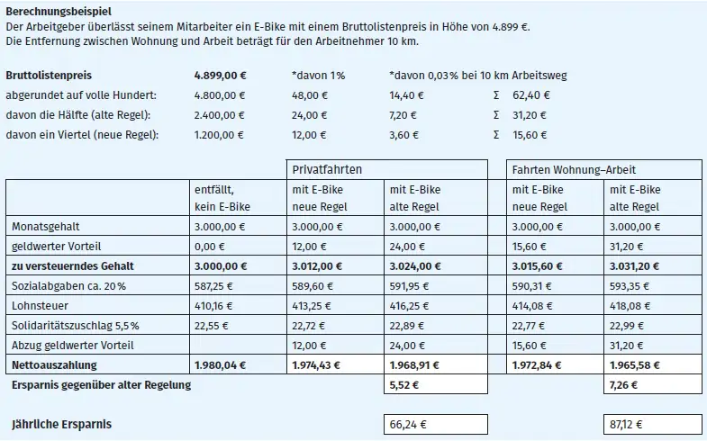 Wir haben anhand des folgenden Berechnungsbeispiels die jährliche Ersparnis für Privatfahrten und für Fahrten zwischen Wohnung und Arbeitsstelle durchgerechnet. Dabei nehmen wir an, dass Sie als Arbeitgeber Ihrem Mitarbeiter ein E-Bike mit einem Bruttolistenpreis in Höhe von 4.899 Euro überlassen. Die Entfernung zwischen Wohnung und Arbeit beträgt für ihn 10 km. Dann ergibt sich folgende Rechnung: